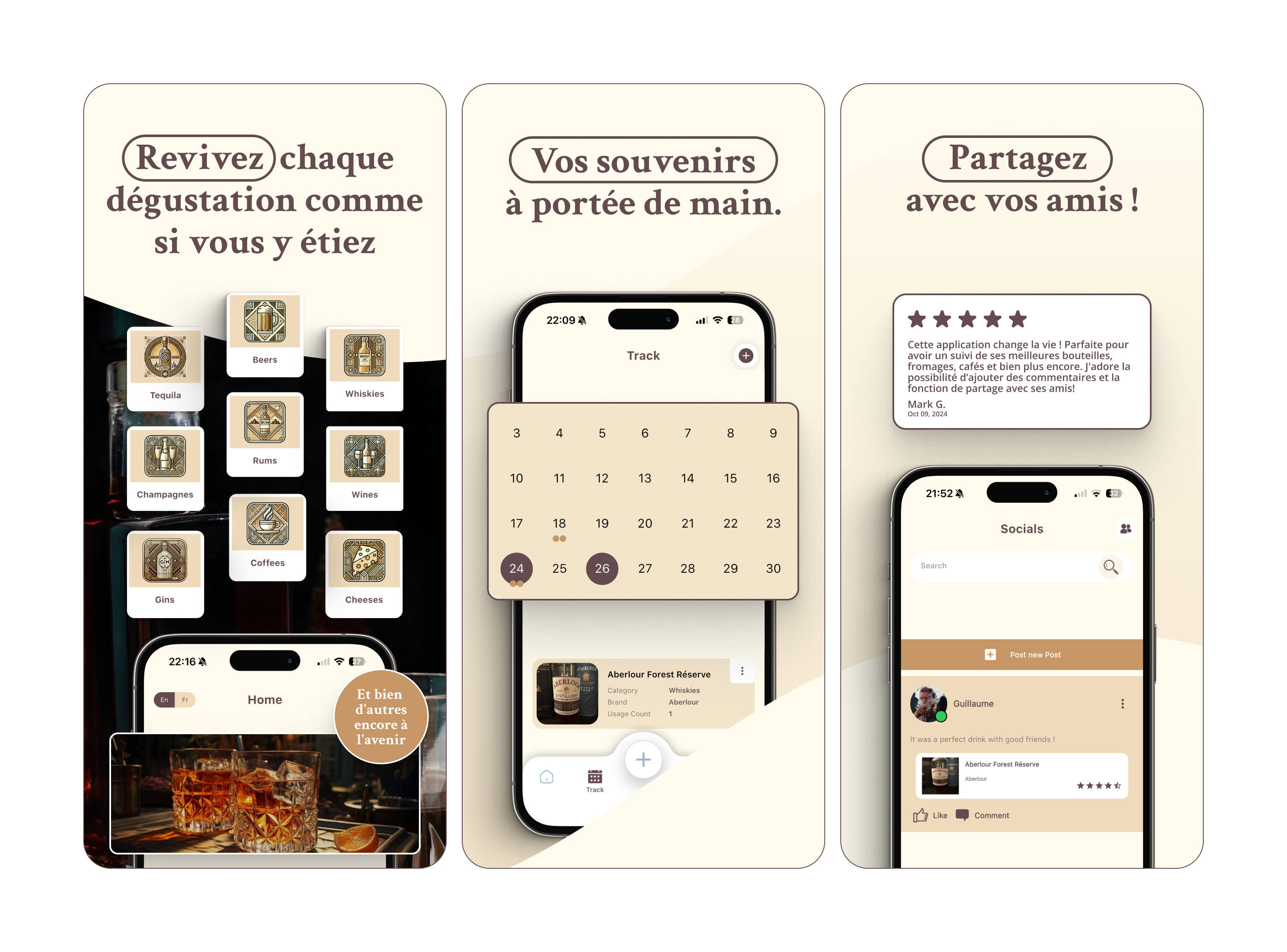 Notre application vous aide à gérer vos cigares, whisky, champagne, vins, bières, rhums, gins, cafés, fromages... vous pourrez les noter, suivre vos stocks, savoir où et à quel prix vous les avez achetés, les partager avec vos amis, et plus important que tout : ajouter des reviews sur chaque produit et les partager avec vos amis !